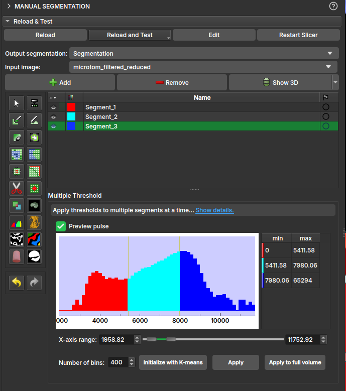 The multiple threshold effect, available in the Volumes, Image Log, Core, and Multiscale environments, allows the user to segment a 3D volume based on multiple threshold values. Depending on the number of selected segments, a histogram with thresholds appears colored in the interface. Each segment will be separated by the threshold, with the next segment starting at a slightly higher threshold on the grayscale. This way, the image can be easily segmented based on its grayscale values.